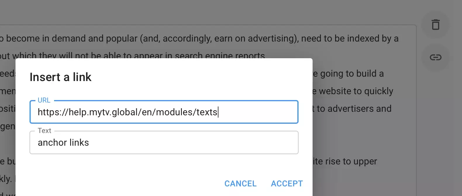 You may put a link in the text of the article by highlighting the required key query and clicking on the link icon to the right of the text block. As a link, you can use both the pages of your site and external sites with which you have agreed on partnerships and link exchanges. In the case when the link leads to other pages of the site, contextual links are thus provided, which have a great influence on the depth of browsing.